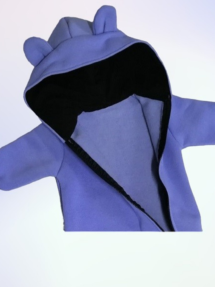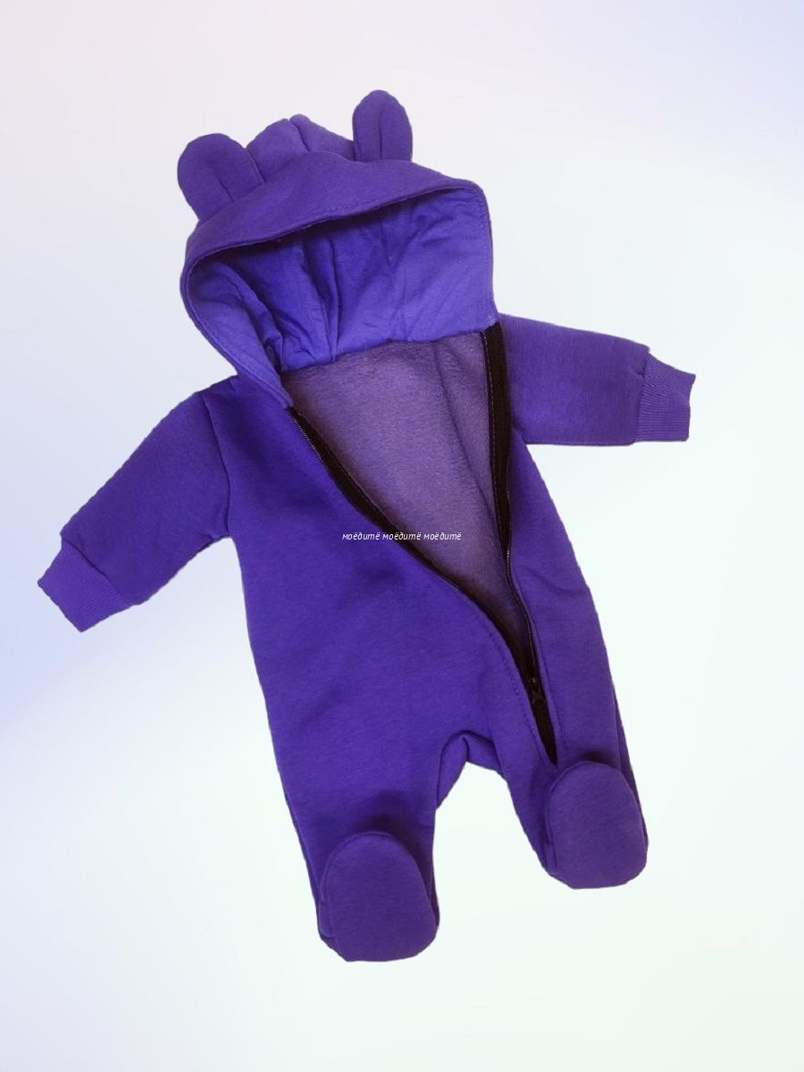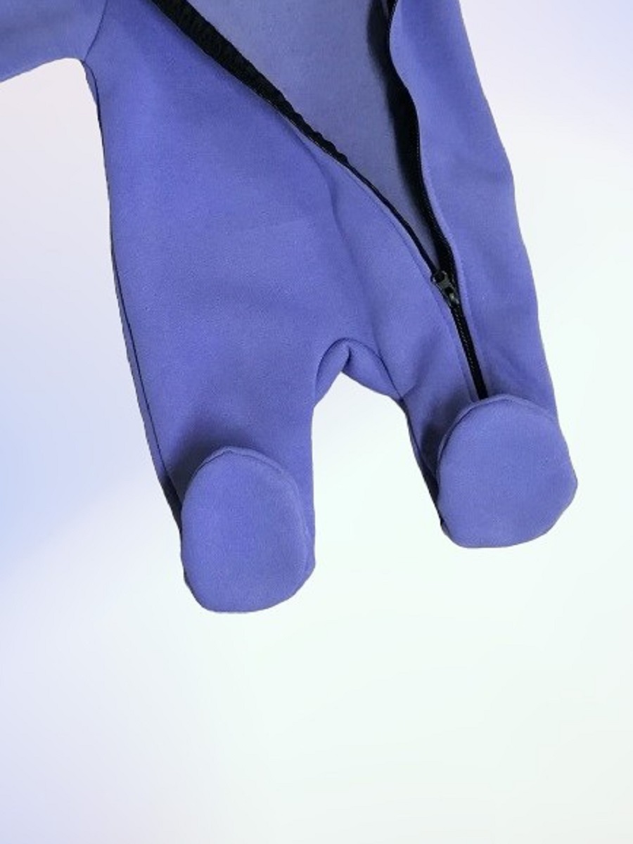 Комбинезон с закрытыми ножками, с капюшоном на подкладке, молния по всей длине и до конца одной ножки.