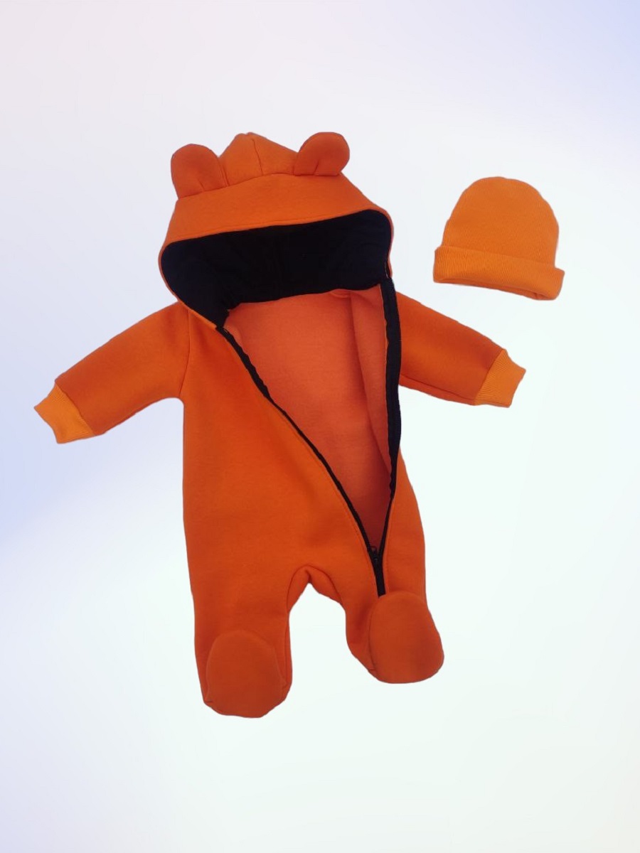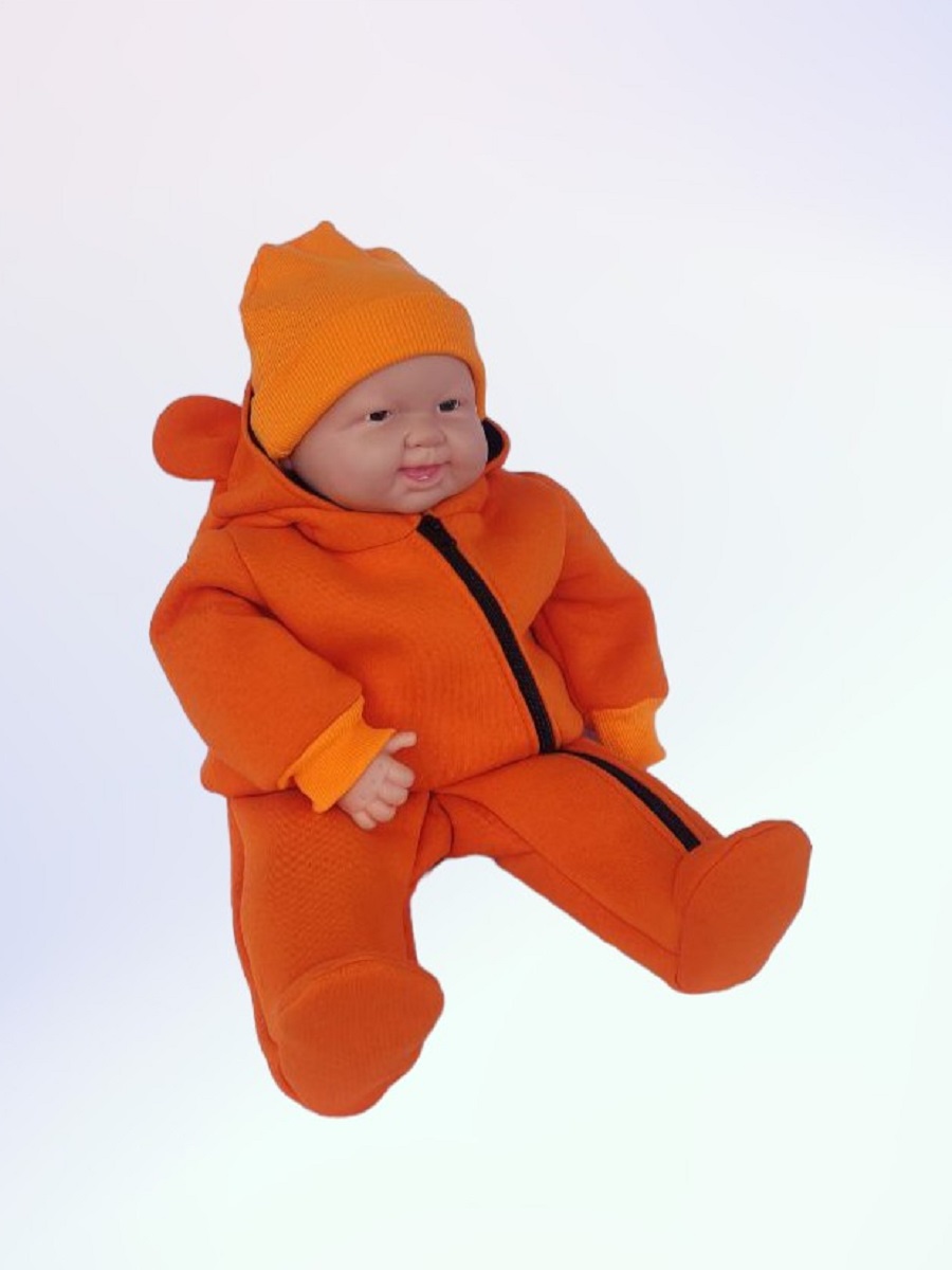 "МоёДитё" комбинезон выполнен из футера с начёсом. Комбинезон с капюшоном на подкладке и декорирован сверху ушками, с закрытыми ножками, рукава на манжетах, спереди косая молния до конца одной ножки. Шапочка из кашкорсе можно одевать как с отворотом, так и без. Очень хорошо тянется.